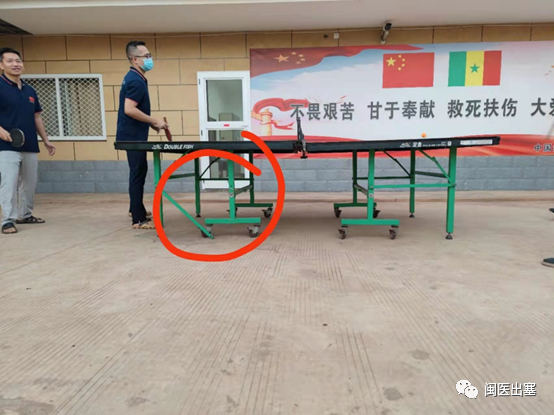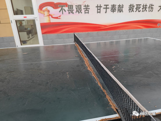 说起这个乒乓球桌可能有点历史了,上一批医疗队资产交接的时候我们惊喜地发现还有一张乒乓球桌,几个队员一起给它好好洗洗,冲掉蜘蛛网和灰尘,感觉面目一新,然后修修桌子腿和轮子,感觉勉强还能用,但是还是缺了一个移动的挂钩、有一个轮子会掉,搬动起来主要是靠力气。虽然“瘸腿”,但好歹也是双鱼的乒乓球桌,我们很珍惜。