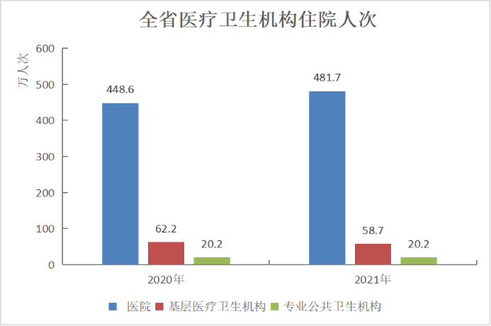 2021年入院中,医院481.7万人次(占85.88%),基层医疗卫生机构58.7万人次(占10.46%),其他机构20.5万人次(占3.66%)。与上年比较,医院入院增加33.1万人次,基层医疗卫生机构入院减少3.5万人次,其他医疗机构入院人次与上年持平