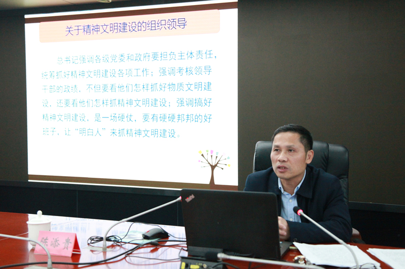 陈添贵主任从高举旗帜,以习近平总书记关于精神文明建设的重要论述统领文明单位创建工作;对标对表,在科学有效中增强创建针对性;突出重点,在落细落实中提升创建工作水平;共创共享,在全员参与中凝聚强大创建合力等4个方面对精神文明创建工作作了深入解读。