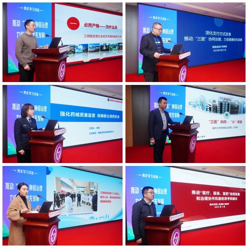 3月31日,省卫健委联合省医保局、省药监局,在福州市第二总医院妇幼保健院举办主题为“推动‘三医’协同治理,力促健康优先发展”的青年学习讲堂活动,深入学习贯彻党的二十届三中全会精神,习近平总书记在福建考察时的重要讲话精神,全国、全省“两会”和卫生健康工作会议精神,引领三部门青年以“奋勇争先、再上台阶”的实际行动,在新征程改革实践中争优争先争效。