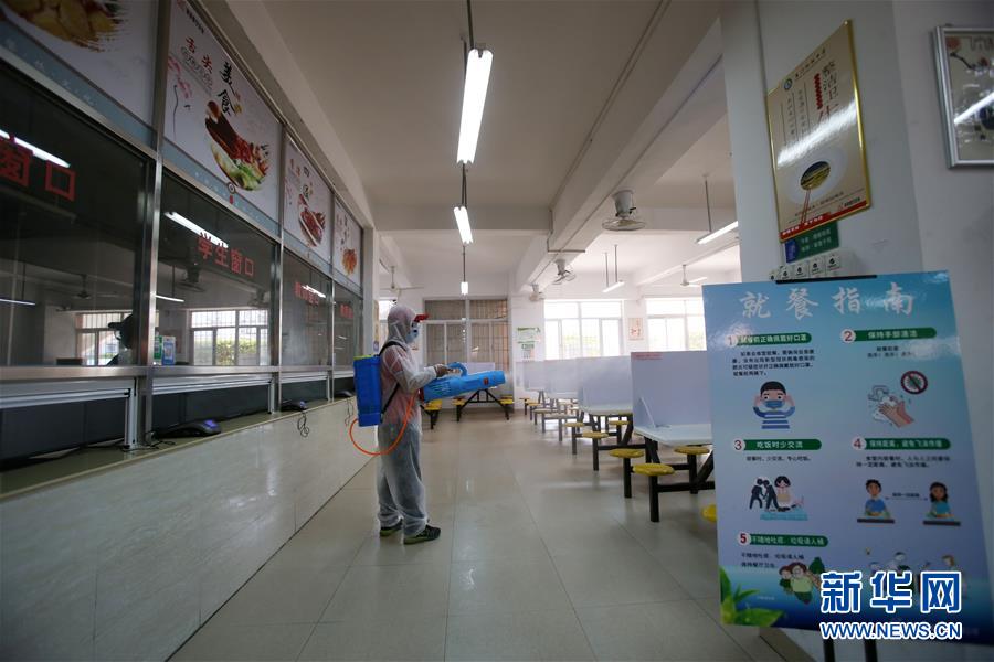 4月18日,在厦门松柏中学初中部,工作人员对校园餐厅进行消杀作业。新华社发(曾德猛 摄)