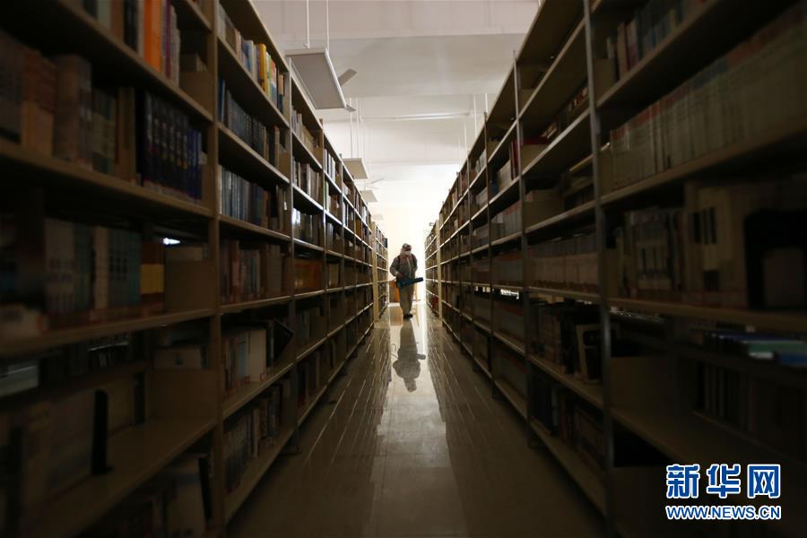 4月18日,在厦门松柏中学初中部,工作人员对学生阅览室进行消杀作业。新华社发(曾德猛 摄)