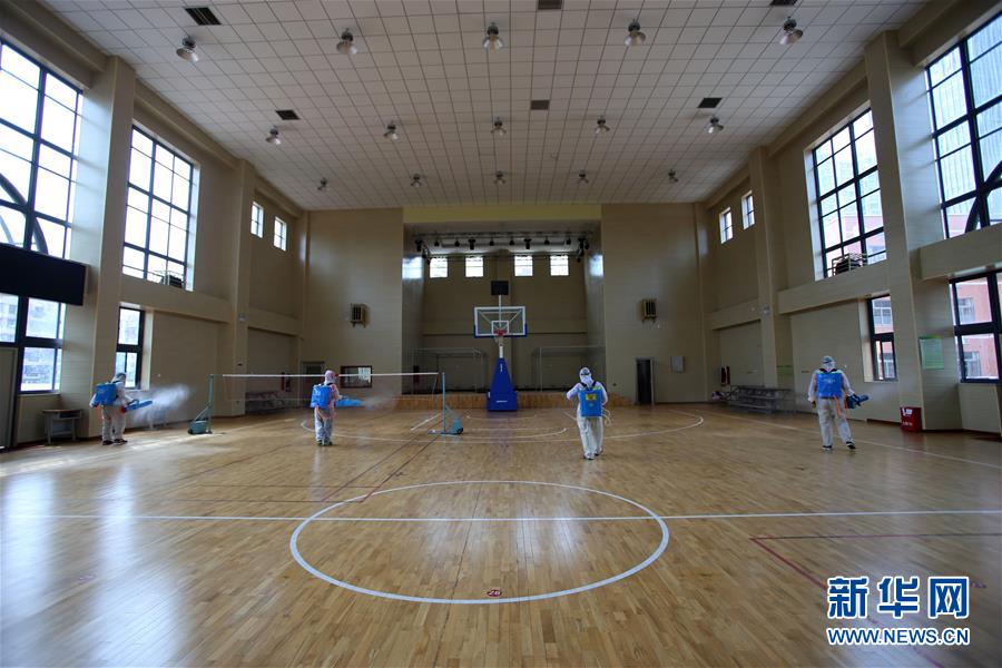 4月18日,在厦门松柏中学初中部,工作人员对室内体育馆进行消杀作业。新华社发(曾德猛 摄)