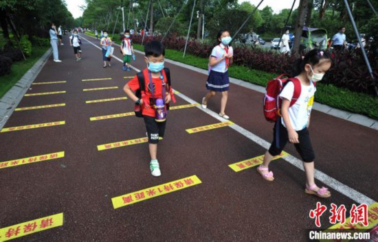 图为福州市仓山淮安实验小学复学的一、二年级学生有续进入校园。 张斌 摄