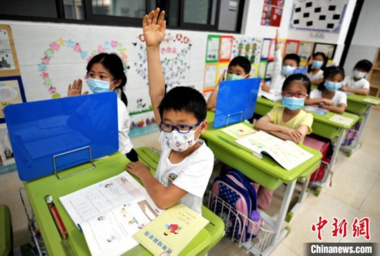 图为福州市仓山淮安实验小学一年级学生举手准备回答老师的提问。 张斌 摄
