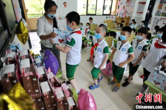 图为福州市仓山淮安实验小学老师在给返校复课的二年级学生发放复学礼包。 张斌 摄