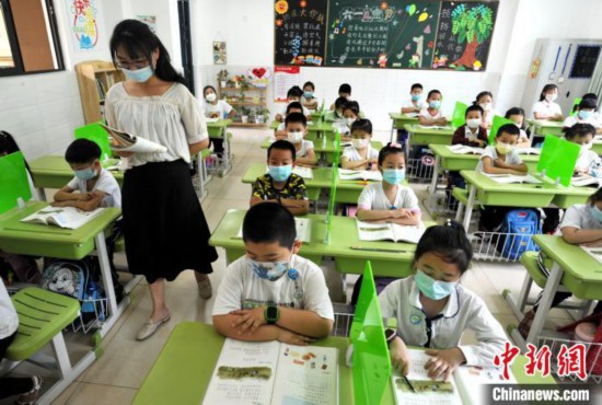 图为福州市仓山淮安实验小学老师在给返校复课的一年级学生上课。 张斌 摄