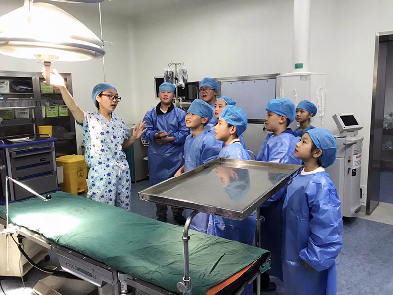 在护士的引导下,孩子们穿上迷你版的隔离衣,戴上口罩和手套,小心翼翼走进手术室,聚精会神听护士介绍手术室环境和日常工作流程,学习海姆立克急救法、日常烧烫伤的急救护理、鼻出血处理等日常救护方法。