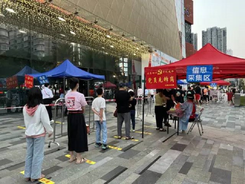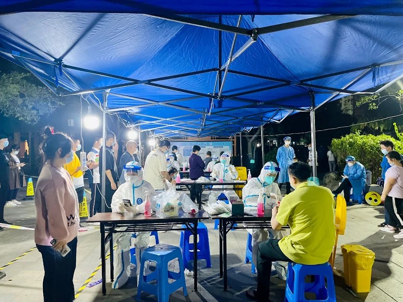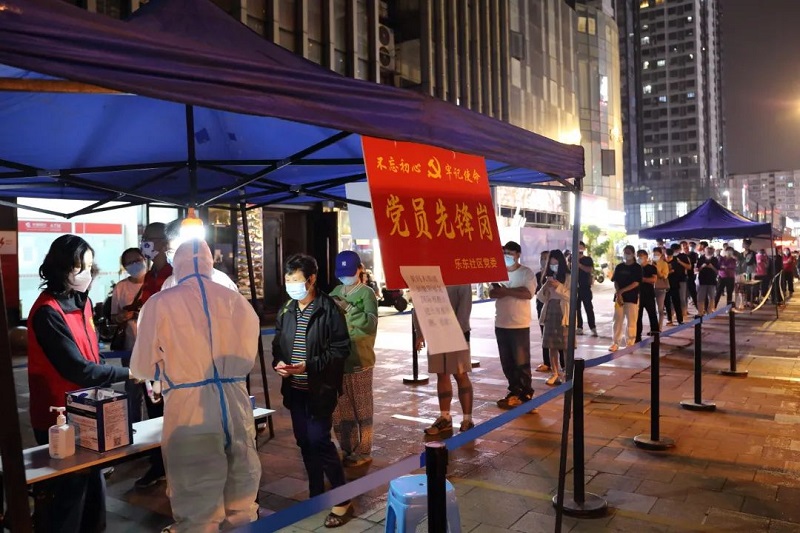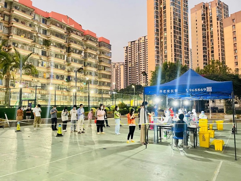 区城管局第一时间组织80余名党员志愿者、执法人员奔赴桂山社区、东山社区、康山社区、南湖社区等核酸检测点位,协助开展区域核酸检测。