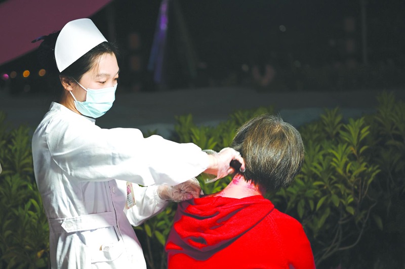 “双手托天理三焦,左右开弓似射雕……”伴着舒缓的音乐,护理部人员现场演示八段锦,引得往来市民纷纷驻足,不少人更是跟着比划起来。夜市期间,每晚定时的功法展示,将这里变成了一场众人参与的露天“养生课堂”。