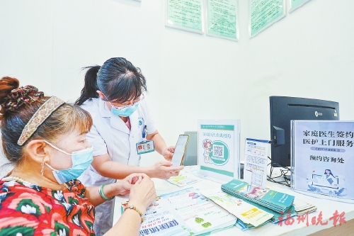 台江区新港街道社区卫生服务中心的工作人员向居民推广家庭医生服务。