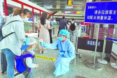 4日,在承接武夷山景区客流的高铁南平市站,旅游和回乡探亲的返程旅客陆续增多,迎来返程高峰。南平市第二医院派驻护士在进站口为旅客测量体温,协助做好流动人口密集区域的发热人员排查工作。针对体温检测筛查出的发热人员,严格执行疫情应急管理及相关通报制度。