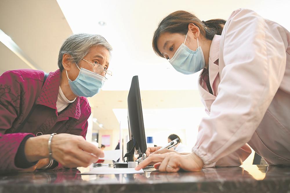 三明市第一医院的医保办工作人员(右)向前来咨询药品报销问题的居民讲解相关政策。 姜克红 摄