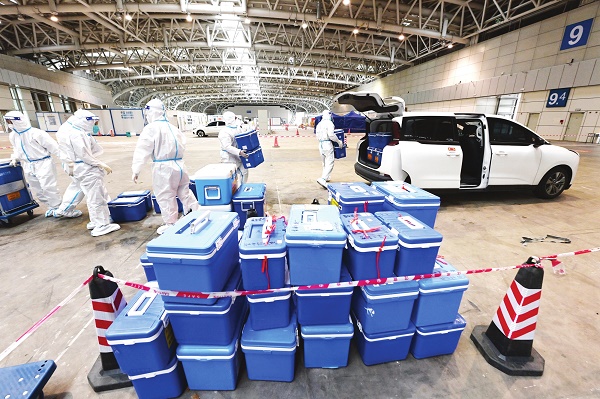 11月1日,福建福州,气膜方舱实验室正全力运行,开展核酸检测工作。图为工作人员在搬运核酸检测样本箱。中新社记者 王东明 摄