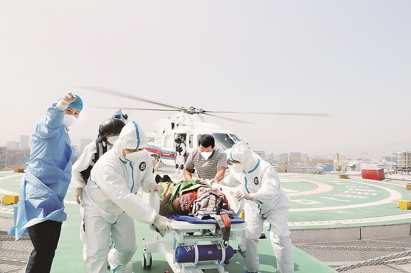 华山附一医院医护人员正通过直升机转运患者。(受访者供图)
