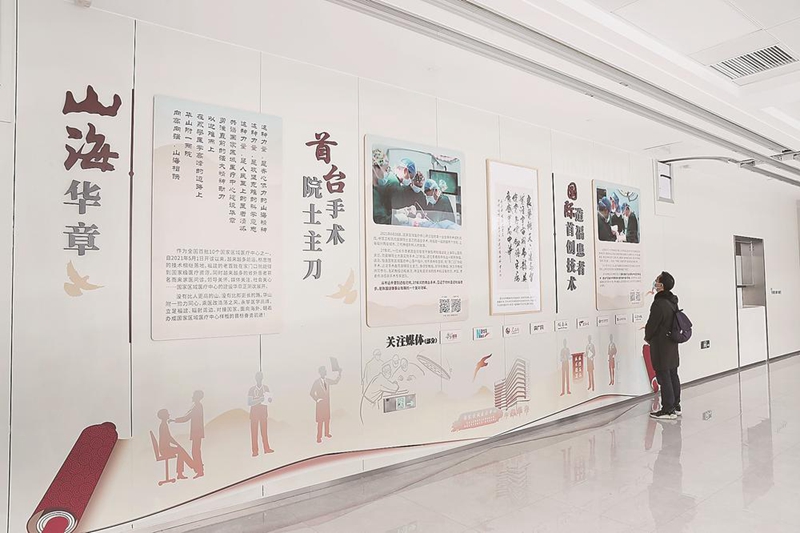 在华山附一医院,患者在山海文化墙前驻足了解华山医院、附一医院合作发展的历程。