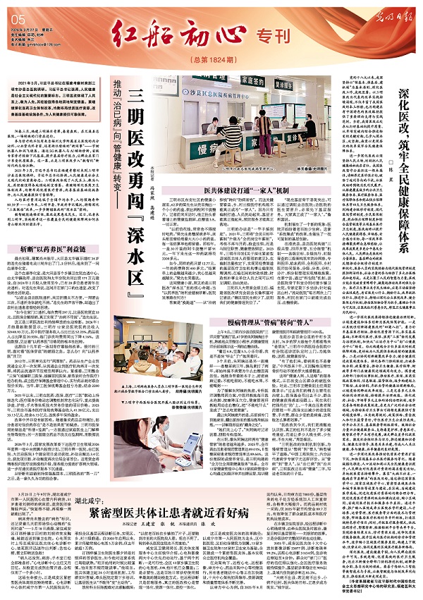 3月27日,《光明日报》05版聚焦福建三明持续深化“三医联动”改革,解锁医改“深水区”密码。报道包括:《推动“治已病”向“管健康”转变——三明医改勇闯“深水区”》《深化医改,筑牢全民健康保障体系》