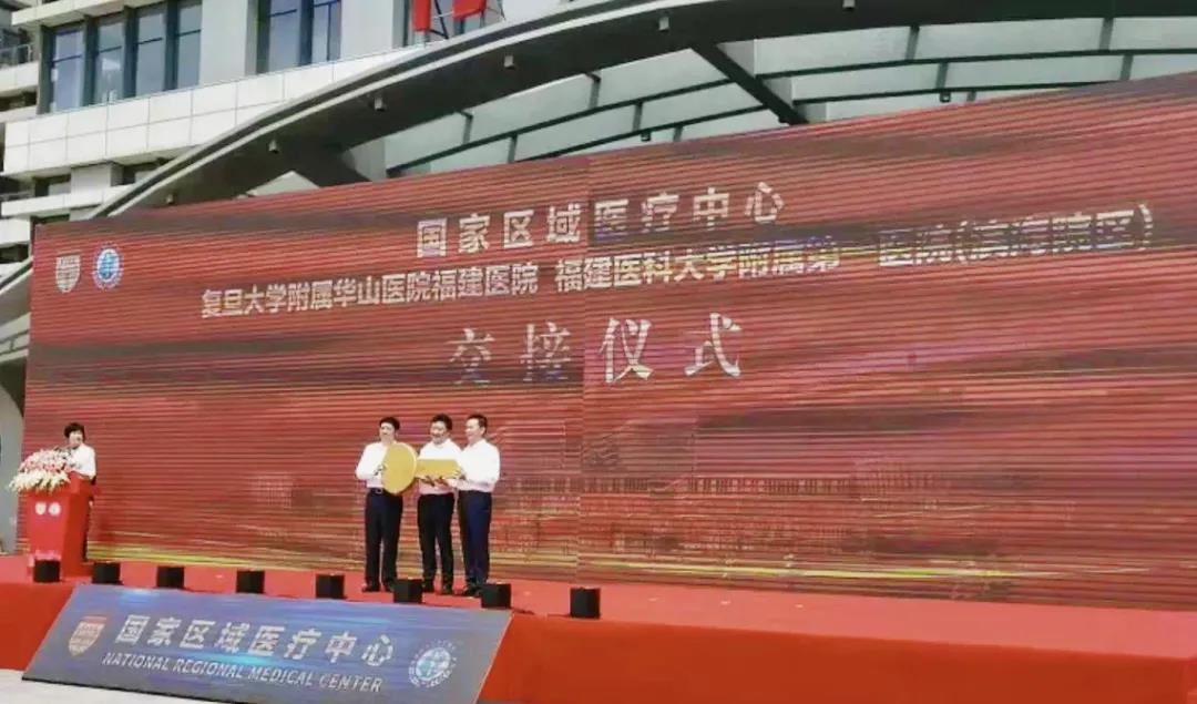 开诊仪式上,福州市市长尤猛军将国家区域医疗中心的“钥匙”交给复旦大学附属华山医院院长毛颖和福建医科大学附属第一医院院长康德智。福建医科大学党委书记何明华、复旦大学附属华山医院党委书记邹和建、福建医科大学附属第一医院党委书记林章雅与华山、附一两院干部职工代表以及到场的嘉宾们,共同见证了这一历史时刻。