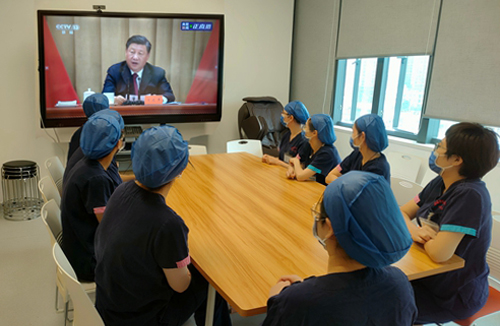 福建省立医院援沪医疗队队员、省立金山医院青年文明号号手 林静:听完习近平总书记的重要讲话,我和舱友们深受鼓舞,回望共青团百年“党旗所指就是团旗所向”的青春征程,镌刻下闪亮的印记,今天共青团赓续红色基因,仍引领着广大团员青年为实现中华民族伟大复兴的中国梦贡献青春力量。作为援沪医务人员,我们将会用实际行动践行“人民至上、生命至上”的宗旨,践行“精于医术、诚于医德”的院训,必将照顾好每一位患者,为上海疫情防控贡献福建卫健青春力量,这是对百年青春最好的致敬,也是对党的二十大最好的汇报。
