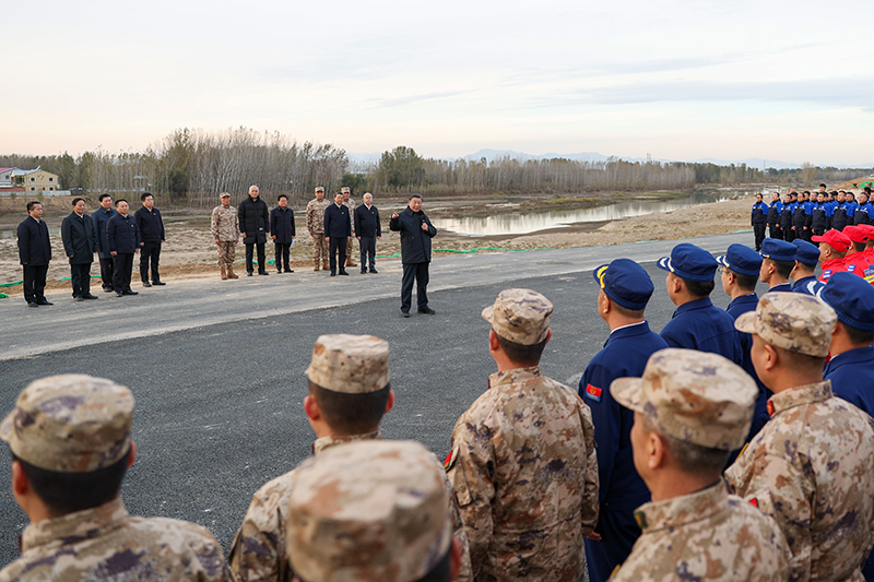 11月10日,中共中央总书记、国家主席、中央军委主席习近平在北京、河北考察灾后恢复重建工作。这是10日下午,习近平在河北保定涿州市白沟河治理工程(涿州段)考察时,同水利工程建设人员和曾经参加涿州抗洪救援的解放军和武警部队官兵、民兵预备役人员、消防救援队伍等方面的代表亲切交流。新华社记者 岳月伟 摄