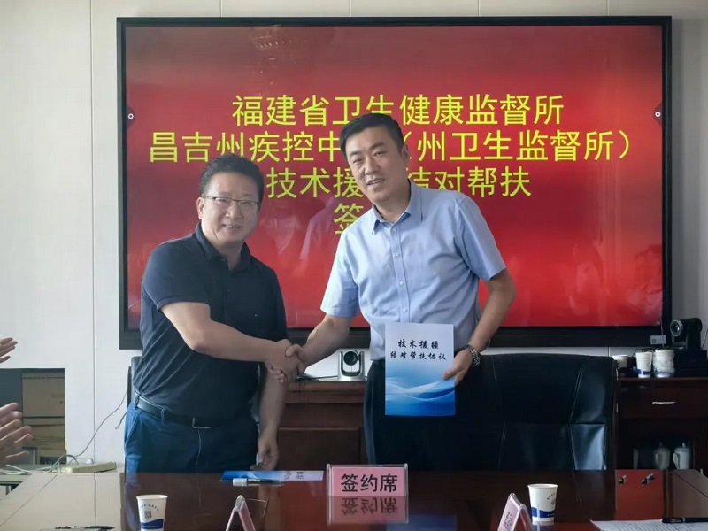 7月22日下午,福建省卫生健康监督所和昌吉州疾控中心(州卫生监督所)召开对口支援工作座谈会,闽昌两地卫生健康监督部门领导签订技术援疆结对帮扶协议,进一步加强卫生健康监督对口支援工作力度,深化双方协作交流,提升昌吉州卫生监督系统人员执法能力。