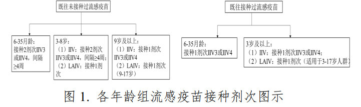 我国批准上市的流感疫苗包括三价灭活疫苗(IIV3)、三价减毒活疫苗(LAIV3)和四价灭活疫苗(IIV4)。对可接种不同类型、不同厂家疫苗的人群,可自愿接种任何一种流感疫苗,无优先推荐。不同类型流感疫苗的适用人群可参见下图。