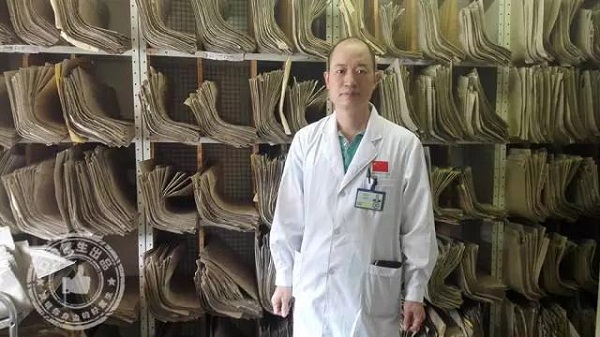 站在科室片库前合影,卢涛背后是两年来部分病人的检查结果