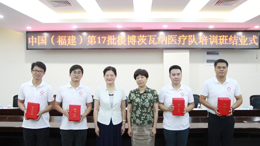 9月4日下午,第17批援博茨瓦纳医疗队出国前集中培训结业仪式在福建医科大学举行。省卫健委党组成员、副主任、一级巡视员王喜瑛参加活动并为队员颁发结业证书。福建医科大学党委常委、副校长佘菲菲,福建医科大学国际交流与合作处、后勤管理处、文理艺术学院,省卫健委外合处、省卫健人才服务与对外交流合作中心有关负责同志以及中国(福建)第17批援博茨瓦纳医疗队全体预备队员参加活动。