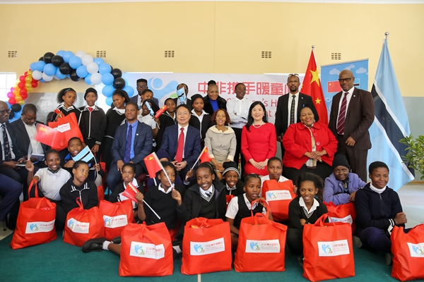 5月26日,“中非携手暖童心”关爱博茨瓦纳儿童健康活动在茨瓦拉哈诺小学举行,驻博茨瓦纳大使王雪峰及夫人童新陪同博总统夫人妮奥·马西西慰问孩子们并捐赠“爱心包”。郭振光公参、杨迅雷参赞、中国援博医疗队、博总统部、外交部、教育部、卫生部、学生代表等500余人出席。