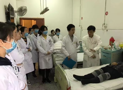 吴际生主任(图右)在病房查房中向年轻医生讲解中医康复临床治疗要点