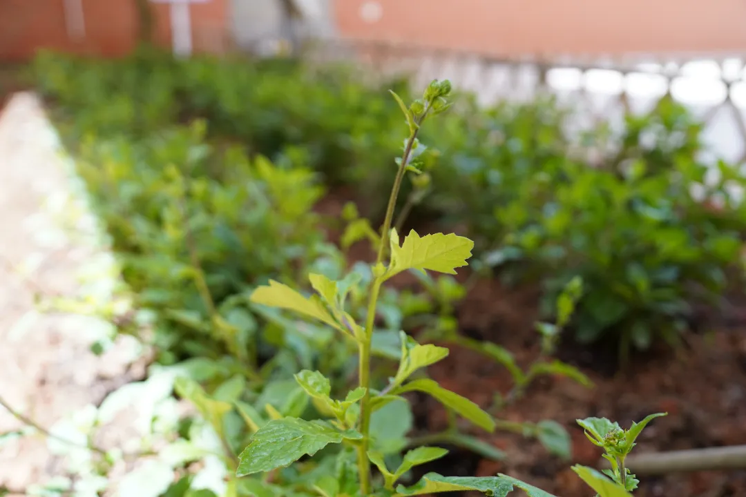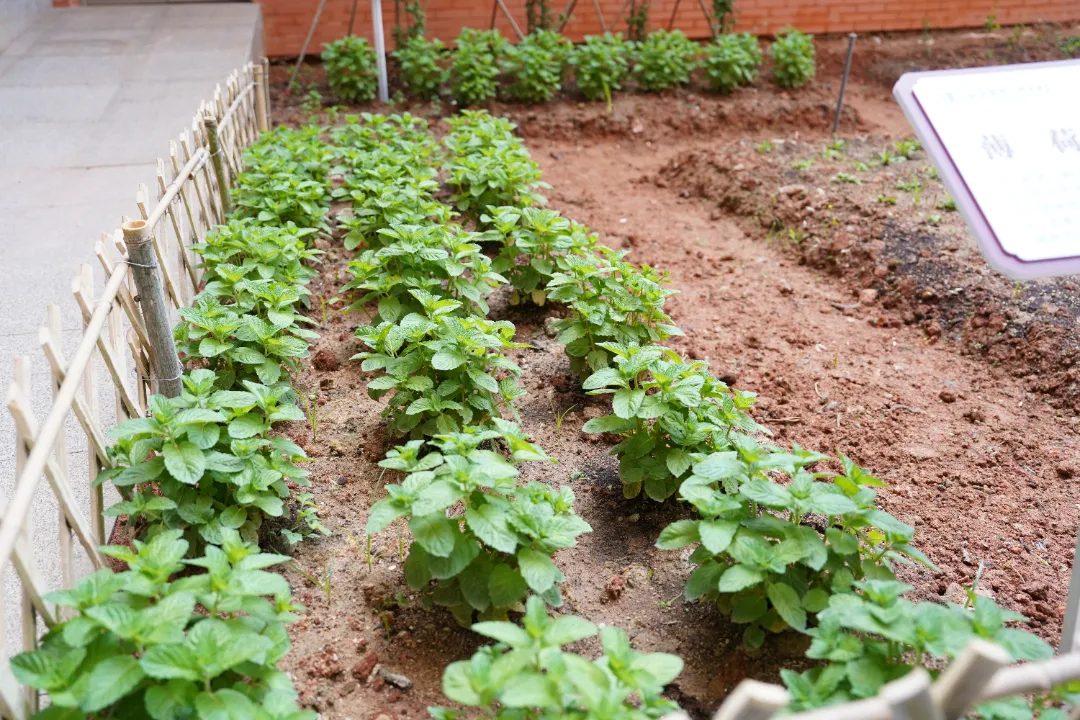走进新落成的实践基地,眼前的景象令人欣喜。“勤毅・青蘅园”内,薄荷、紫苏、忍冬(金银花)、枸杞、片仔癀、桑葚等草本植物错落有致,嫩绿的枝叶在微风中轻轻摇曳;“信诚・百草圃”里,益母草、艾草、鱼腥草、板蓝根、金丝皇菊、马齿苋等中药材生机勃勃,散发着淡淡的药香。很难想象,这片充满生机的中草药种植区,数月前还是一片闲置土地。
