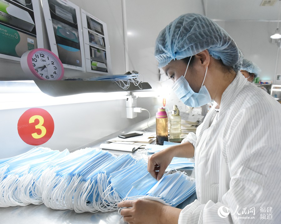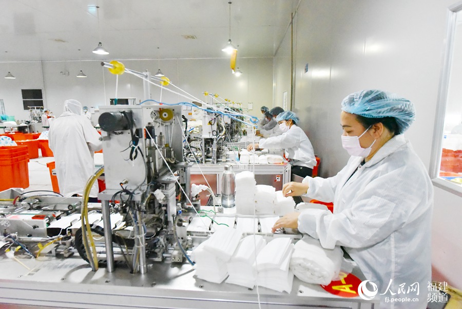 29日晚,漳浦县健德医疗器械有限公司厂房内工人加紧生产医用口罩。 余杉芳摄
