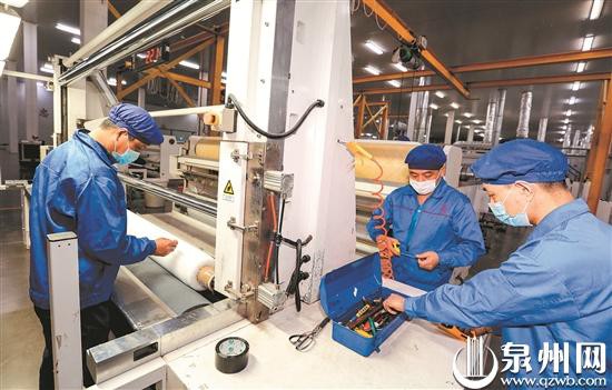 2月1日,在南安市雪峰开发区,福建省乔东新型材料有限公司的生产车间内,提前返岗的工人们正加紧生产防护服、口罩、成人纸尿裤的原辅材料,为下游防护服、口罩、纸尿裤生产企业提供物资保障。(林书修 林劲峰 黄瑜鹏 摄)