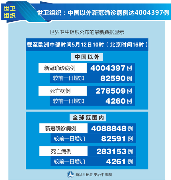 新华社日内瓦5月12日电(记者刘曲)世界卫生组织12日公布的最新数据显示,中国以外新冠确诊病例达到4004397例。