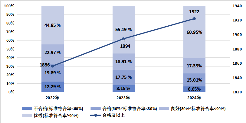 为进一步完善医疗卫生服务体系,落实分级诊疗制度,不断提升县医院医疗服务能力,我委持续开展县医院医疗服务能力第三方评估。2024年度参评医院2059家,县域覆盖率98.93%。根据我委2016年印发的县医院医疗服务能力基本标准和推荐标准(其中,基本标准相当于二级医院能力,推荐标准相当于三级医院能力),有1922家(占比93.35%,提高1.50个百分点)符合基本标准,1309家(占比63.57%,提高7.17个百分点)符合推荐标准,较2023年度分别增加28家、146家(见图1、图2)。现将2024年度评估情况通报如下: