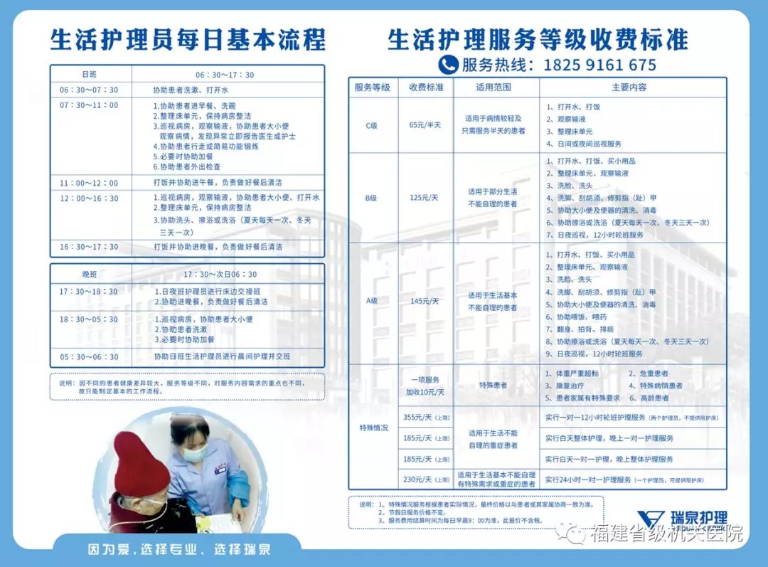 护理员管理采取“五统一”管理模式, 由总务科(支持中心)、护理部、保卫科等部门共同监督,统一调配、统一着装、统一标识、统一收费标准(《护理员服务等级及收费标准》)、统一管理。