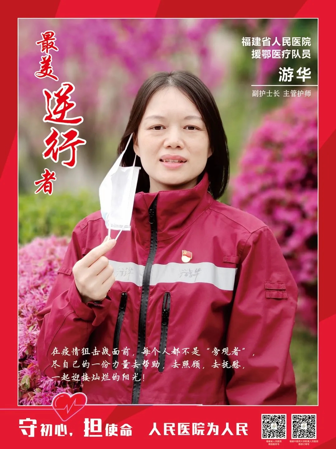 这些简短、勇敢、坚毅的话语,出自我省一位退役女军人游华之口。出生于闽西革命圣地的她,现在是福建中医药大学附属人民医院心血管科副护士长。1998年应征入伍,在部队期间表现优秀,还是第一年新兵的她就获评优秀士兵;2000年以优异的成绩考入第二军医大学南京军医学院,成为一名军护,2003年实习毕业之际直接投身防抗“非典”;2007年部队转业,后调到福建中医药大学附属人民医院,至今一直奋战在重症病患护理一线。