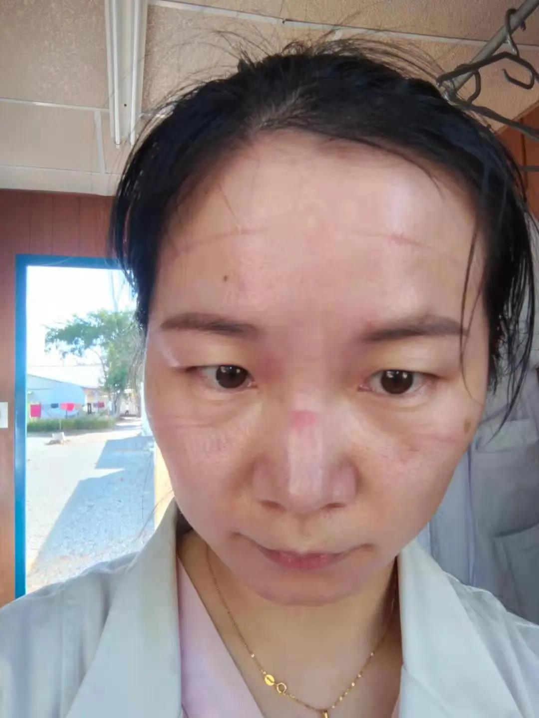 第二天一早,来上班的队友在医院遇到刚下班的黄丽主管护师,工作服已经湿透,跟刚从水里洗出来的衣服一样。N95口罩在脸上、鼻梁上留下的压痕清晰可见,皮肤几近破溃。队友看见这一幕,心疼不已。
