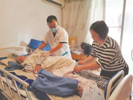 曹彦龙医生(左)在换药前协助家属为病人翻身