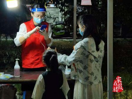 当天下班五点半左右,志愿者陈肖刚下班,还没来得及吃口热饭,就立马换上“红马甲”衣服,站在小区门口开展验码测温工作。同是上班族的志愿者周奋下了班就赶到采样点,他被称为采样医生的“好搭档”,如今也是现场引导、扫码的熟手。