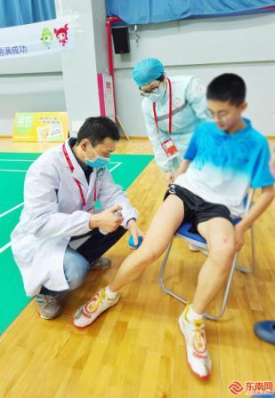 医护人员正在为羽毛球参赛运动员进行对症治疗。郑艺姝 摄