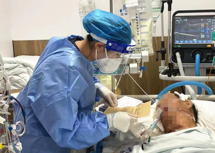 除夕这天,家属来院看望,但老人因气管插管治疗暂时无法说话,护士便建议他们为老人写一封家书,并由护士作为“信使”,到患者床旁读信。