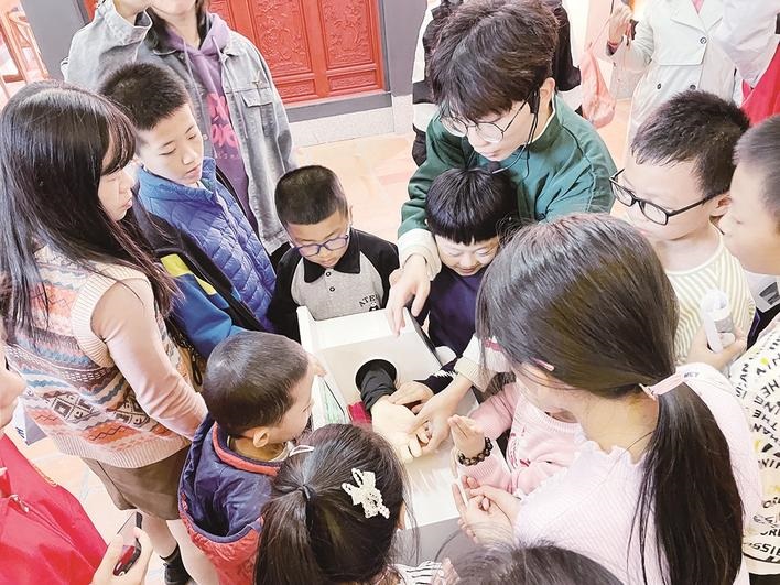 沉浸式的体验为孩子们打开了中医药文化的广博天地,他们在学中玩、玩中学,充分感知中医药的魅力。在摸耳识健康环节,孩子通过耳贴游戏,深入了解耳朵结构、耳穴位置及功能。在杏林学堂,孩子们近距离观赏传统的药用器具、精美的中草药标本,还认真听了许多经典的中医药故事。在药用植物园,孩子拍照“打卡”,加深对虎尾轮、金银花、肉桂等常见中草药的辨识。(张金连 林琼 文/图)