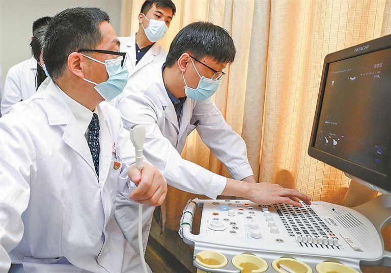 尹震宇书记(左一)与肝胆胰外科副主任王付强(右一)共同为患者进行术前超声检查。