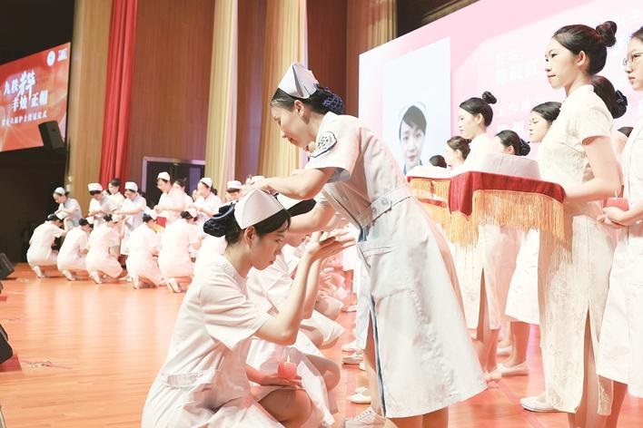 仪式上,来自漳州市医院、漳州市中医院、漳州市人民医院、漳州市芗城区妇幼保健院、联勤保障部队第909医院的校友代表为2022级全体护理助产专业学生授帽。随后,全场近2000名学生起立宣誓,仪式庄严而神圣。漳州卫生职业学院护理学院护理专业学科带头人汪美华说:“护士授冠仪式是一种庄重而神圣的庆祝活动,是护生成为护士的重要时刻。授冠仪式标志着护生将踏着护理前辈的足迹,继承护理前辈的精神和责任,投身光荣的护理事业,让护理职业精神薪火相传。”