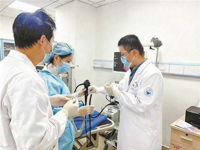 内镜诊疗部谢逸林医生(右)通过“师带徒”的方式,帮助当地医生快速掌握消化内镜基本操作。