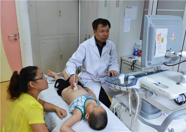 首都医科大学附属北京儿童医院超声科主任医师贾立群给一名患儿做腹部彩超检查(2013年7月22日摄)。新华社记者 王全超 摄