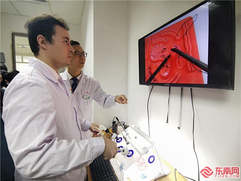 福建援疆专家徐国兵(右)指导伊尔夏提操作腔镜手术模拟训练。 东南网记者 周桂枝摄