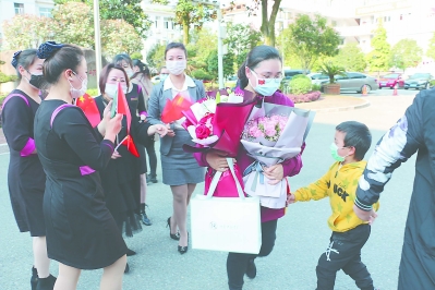 ③7日下午,南平市建阳区三名“逆行英雄”结束医学观察休整期,经核酸检测后,安全回家。不少市民给他们送上鲜花,表达敬意。邓雪 谢富珠 摄