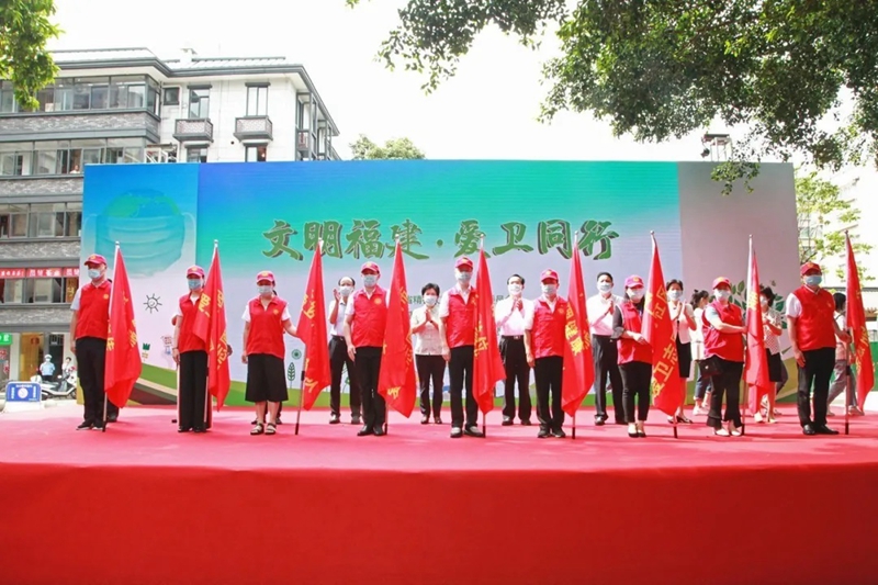 仪式上,全体参与人员共同观看了爱卫主题公益广告。在志愿者代表宣读《文明福建·爱卫同行》倡议书后,邢善萍、林宝金及省直有关单位、福州市领导上台,为省市9支爱卫志愿服务队授旗。